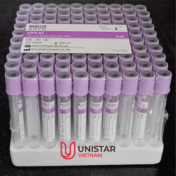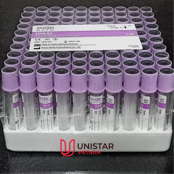 Công dụng: Ống nghiệm EDTA được dùng nhiều trong các phòng thí nghiệm, các bệnh viện lớn nhỏ để xét nghiệm huyết học, được sử dụng chất kháng đông EDTA cùng với nồng độ tiêu chuẩn để giữ các tế bào bên trong máu nhất là tiểu cầu luôn ở trong trạng thái tách rời với thời gian từ 6-8 tiếng.